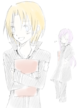 っていうヘンタイキャラが数学の時間に唐突に思いつきました☆(← いやクラスメイトが筆箱落とした時に他の人が拾ってた図を見て、ペンを落として拾ってくれた子が笑顔で「はいどうぞ」とか言ってくれる王道的なものもいいなぁと思いまして。そしてそれにキュンキュンするヘンタイ主人公。架崎には珍しい茶髪で僕キャラの主人公! その友人はクール系で紫長髪がいいなあってすぐに思い浮かびました☆ そして拾ってくれた女の子は一見おしとやかな美少女なのに男勝りで口が悪いとかそんな設定を! 舞台は錬金術育成学校のお話…みたいな。スケッチブックはイメトレに使います。自分が召喚したいものの構図が頭に浮かばないとすっげへろちょろなものが出てきそうだったので! えへへ妄想って楽しいですねw←
