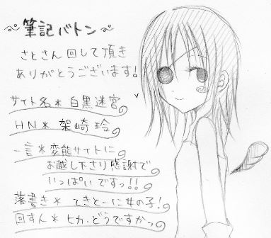 遅くなりましたがさとさんに回して頂いた筆記バトンです! ありがとうございました、とっても楽しかったですv 自分の下手な字が世間に晒されるのはちょっと恥ずかしいけれど! よ、読めますかね…;