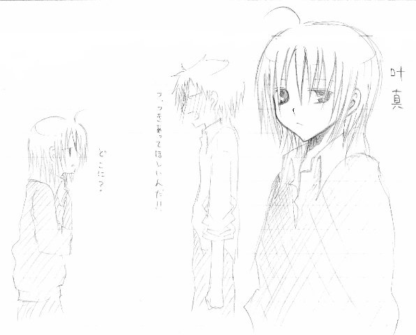 私はいつも目から描き始めるんですけど、友達が輪郭→髪→目って描くって言うので自分もその順番で描いて見たの図。そしたらそのキャラに愛着湧いちゃって(親馬鹿!)名前までつけてシチュエーションも考えたっていう。なんかその説明。≫叶真(カノウ マコト)♀ある組織に所属していて潜入捜査で高等学校に転校生としてやって来る。男装で。その理由も考えたは考えたんですけど語ると長くなりそうなので省略。周りからはちょっと女顔だけど完全に男だって認識されてるのに男子に告白され てるところ。でも「つ、付き合ってほしいんだけど!」って言われて「どこに?」とか答える奴。多分「好きだ」って言われても「はぁ」って答えるんだと思うよこいつ。そんな無気力星人が好きですvv ちなみに潜入捜査で調べてたターゲットが告ってきた男子とかそんなとこまで考えちゃったよ★ どこまで想像に浸ってるんだ私は。あちなみに告ってる男子の名前は越ノ宮学人(コシノミヤ ガクト)。でも頭は悪すぎクラスで最下位。≪